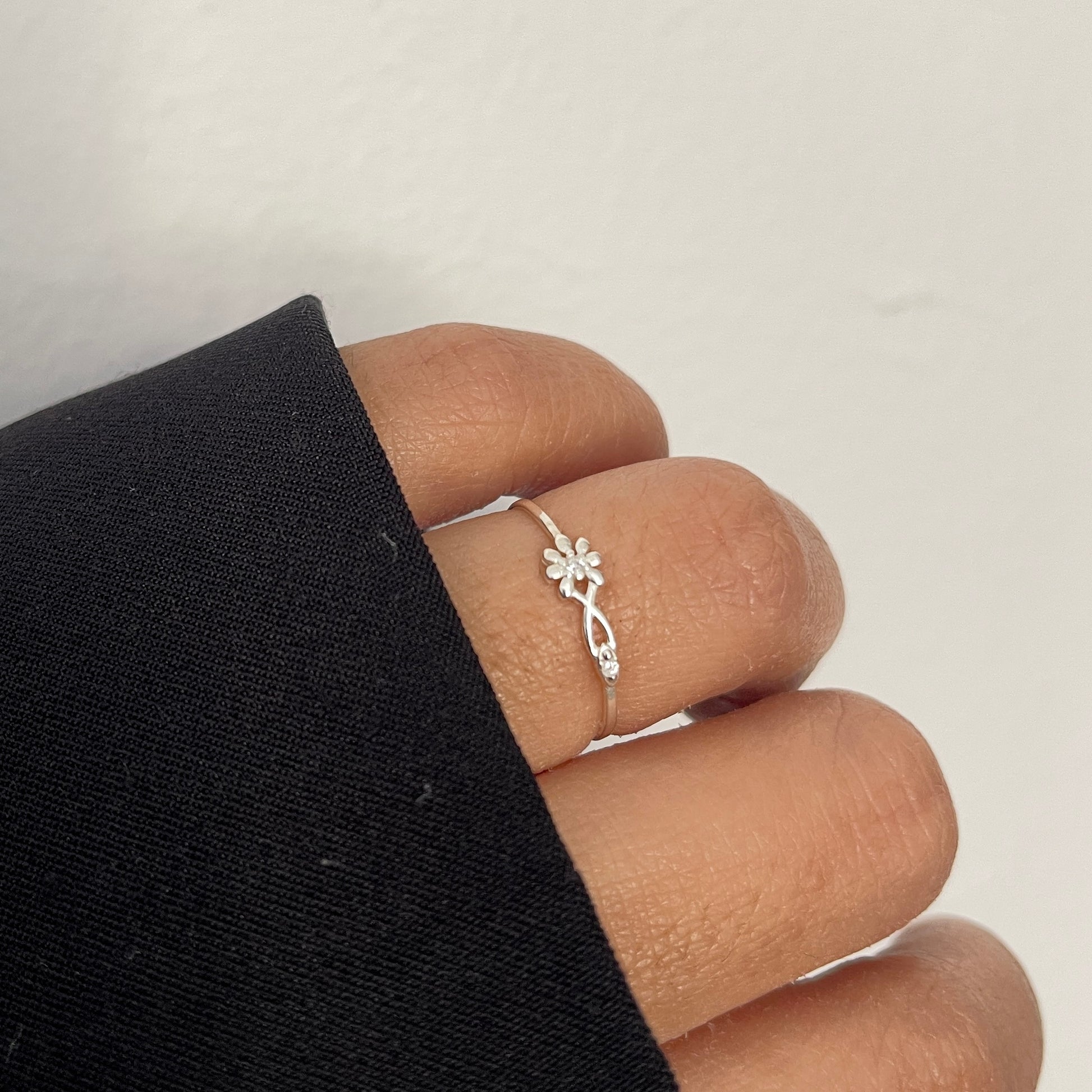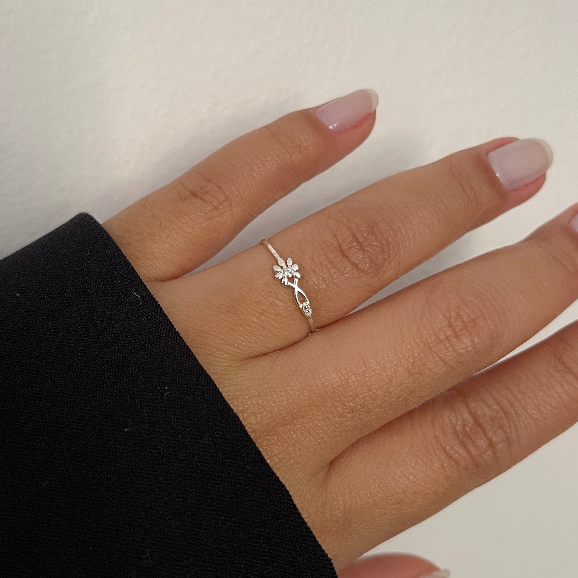 Este é um anel de prata extremamente delicado e romântico. O aro é fino e liso, destacando o detalhe central: uma pequena flor com pétalas vazadas e um ponto de zircônia brilhante no miolo. Abaixo da flor, o aro se entrelaça formando um símbolo do infinito, que é finalizado com outra pequena zircônia. É uma joia feminina e graciosa, perfeita para quem aprecia acessórios sutis e com significado.