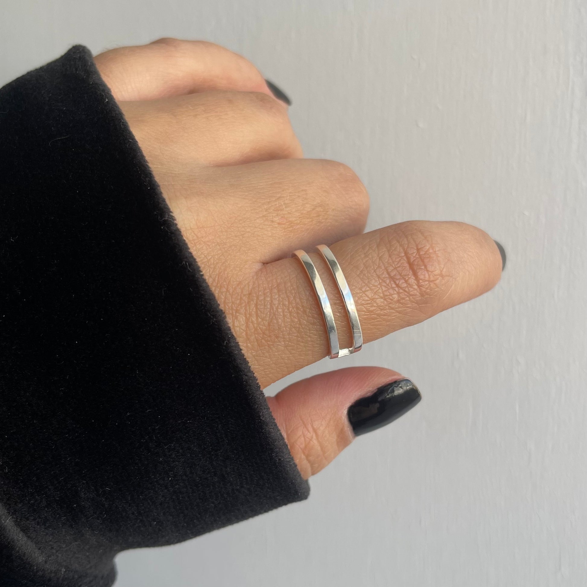 Anel Grads é composto por duas faixas paralelas que criam um espaço vazado no meio, dando a impressão de serem dois anéis finos usados juntos. O acabamento é liso e polido, refletindo a luz de forma sutil. Seu estilo versátil permite que seja usado tanto no dia a dia quanto em ocasiões especiais.