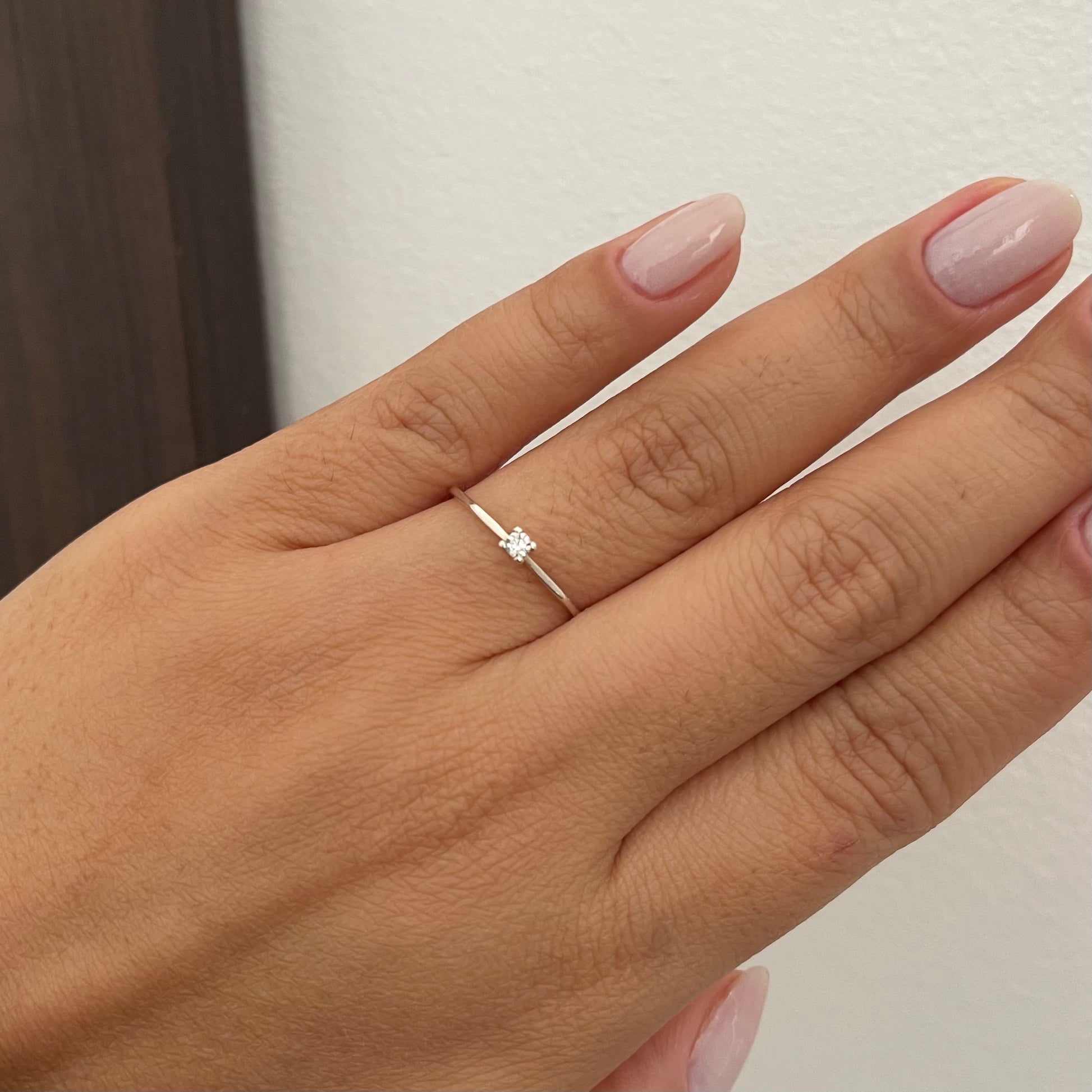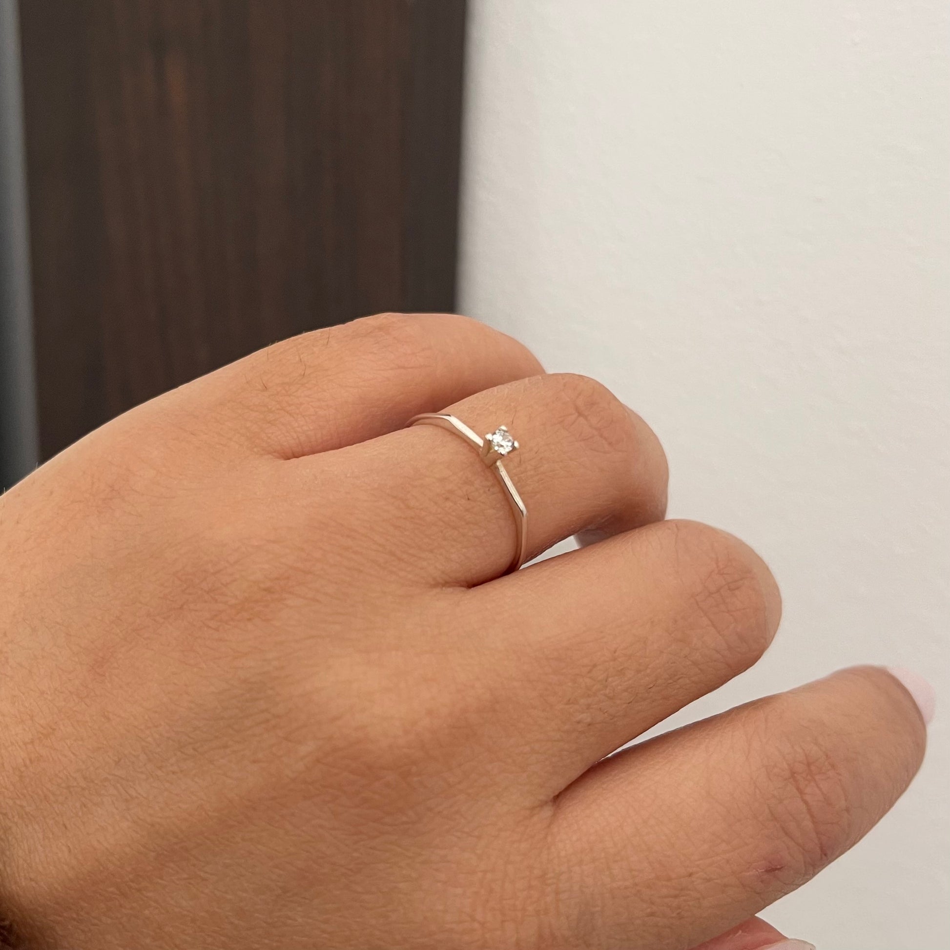 Este é um anel solitário de prata, um clássico do design de joias, que se destaca pela sua elegância e simplicidade. Possui um aro fino e polido que se eleva sutilmente para encontrar uma única pedra de zircônia cintilante, cravada em quatro garras que garantem sua segurança e maximizam seu brilho. O design minimalista e atemporal faz dele a peça perfeita para simbolizar momentos especiais, como noivados e formaturas, ou simplesmente para adicionar um toque de sofisticação ao dia a dia.