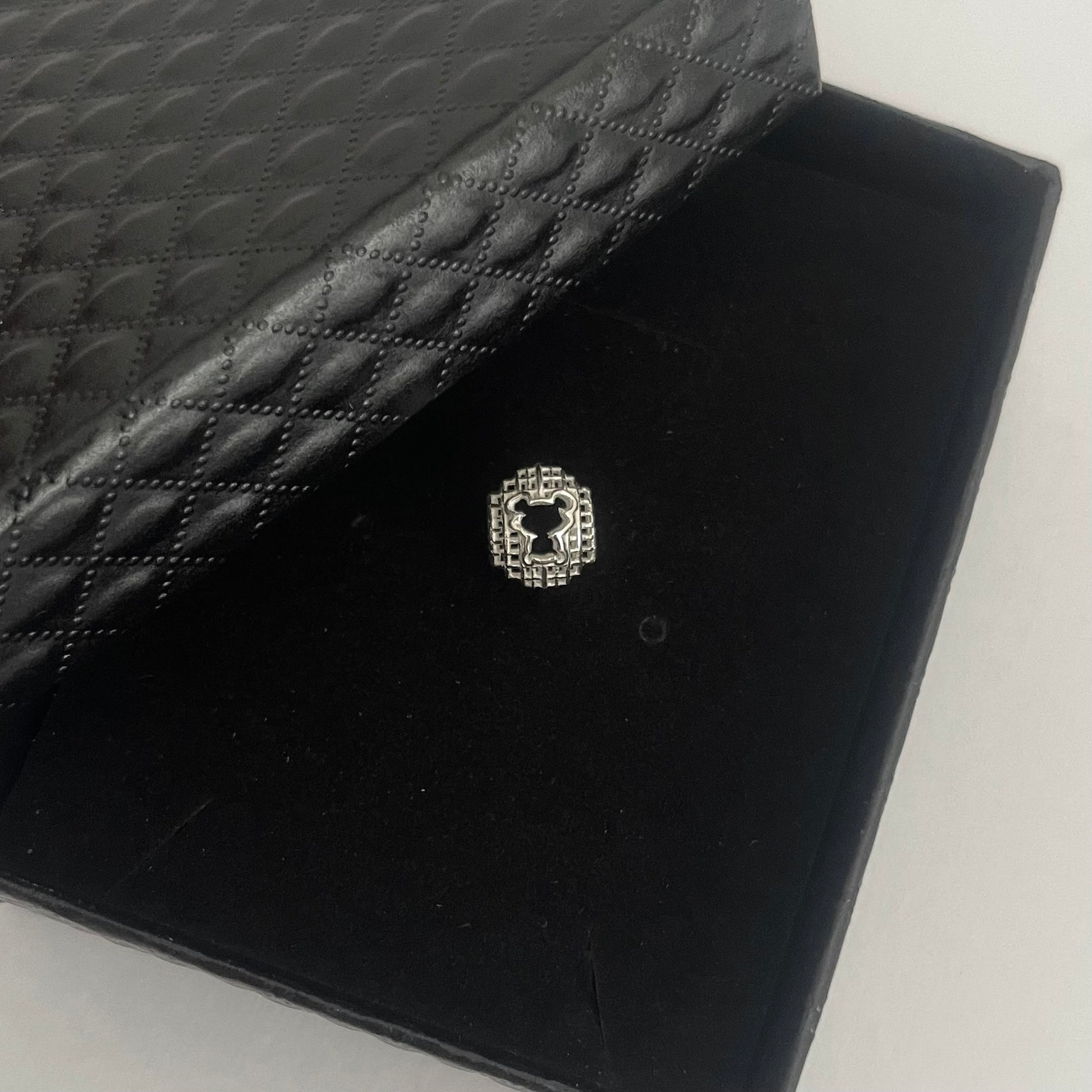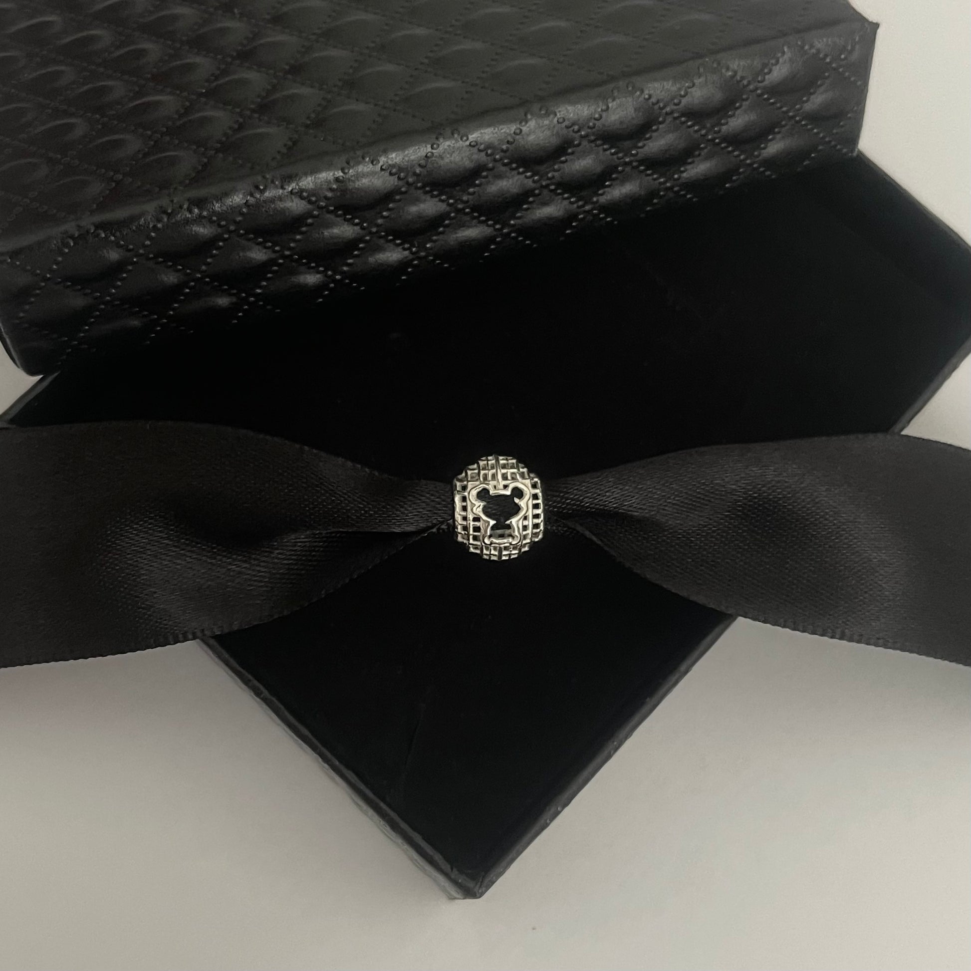 Berloque confeccionado em prata 925, com design delicado que apresenta a silhueta de um ursinho central envolvido por detalhes geométricos, criando um visual moderno e elegante. Com aproximadamente 8 mm de largura, é uma peça compacta, charmosa e cheia de personalidade.