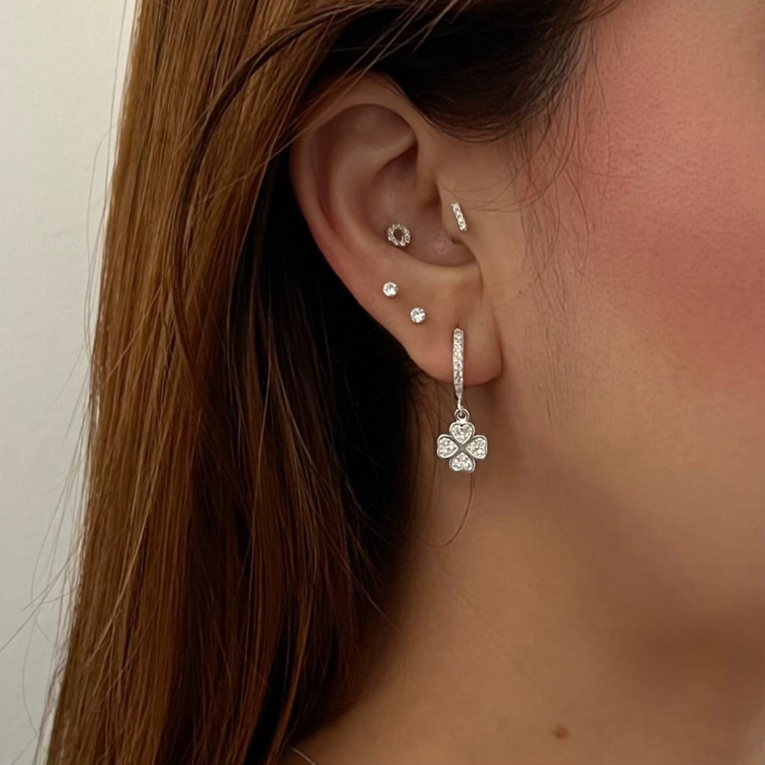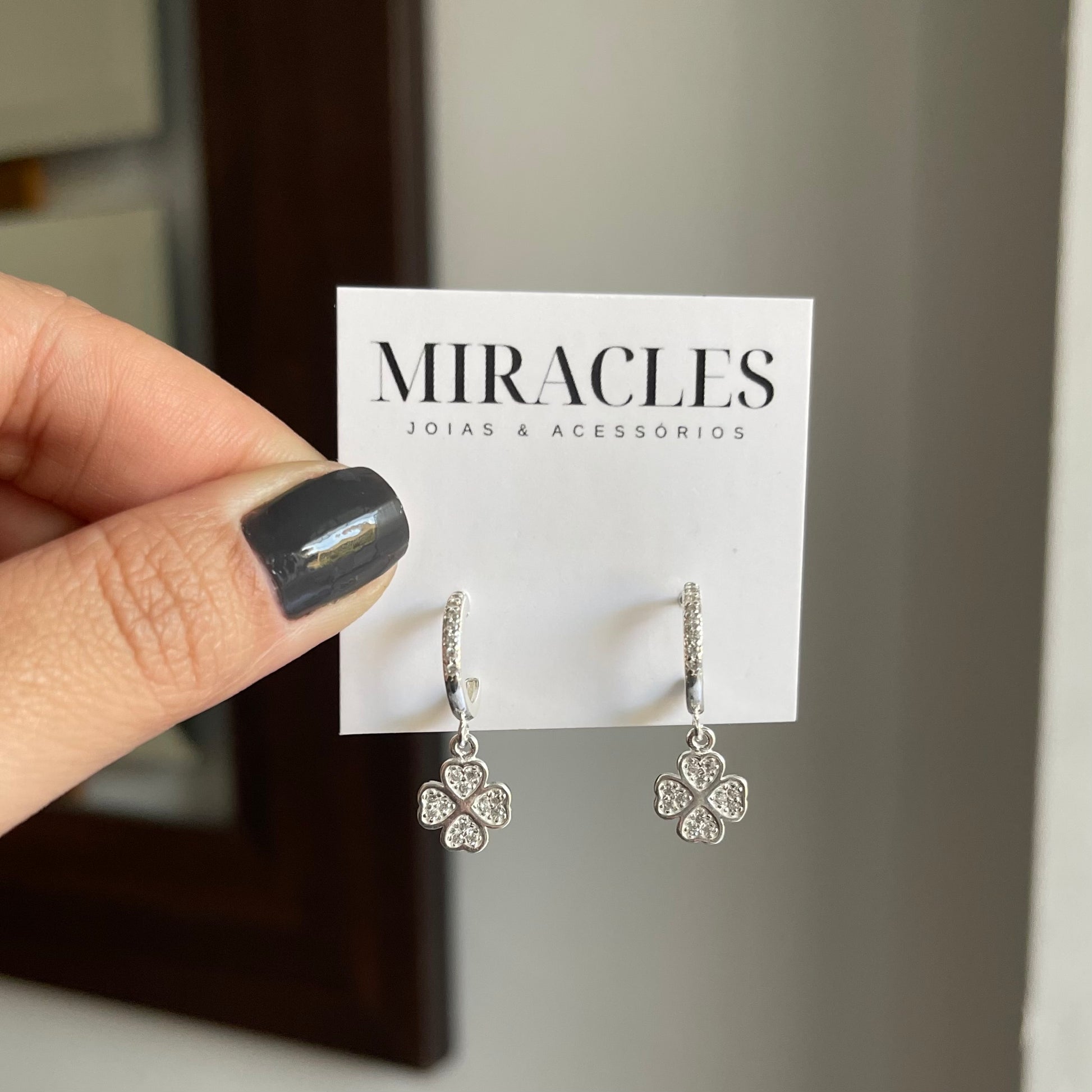 Brinco de argola com pingente de trevo cravejado com pedras de zircônia, símbolo de sorte e boas energias. O design delicado e o brilho das zircônias tornam a peça versátil para usar tanto no dia a dia quanto em ocasiões especiais