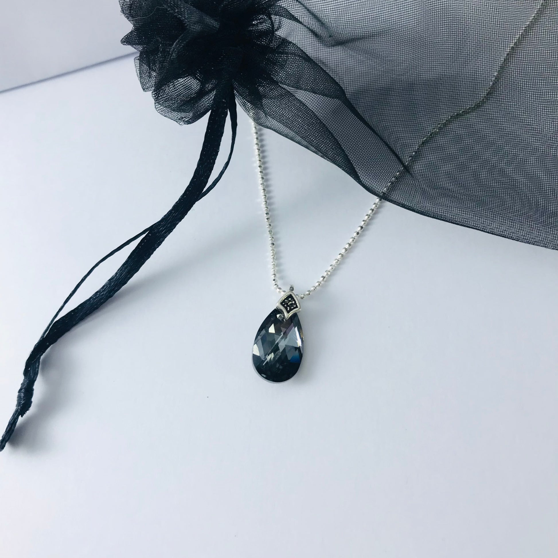 O pingente em formato de gota traz uma zircônia oval de aproximadamente 16 mm por 10 mm, com lapidação que reflete a luz de forma intensa e marcante;