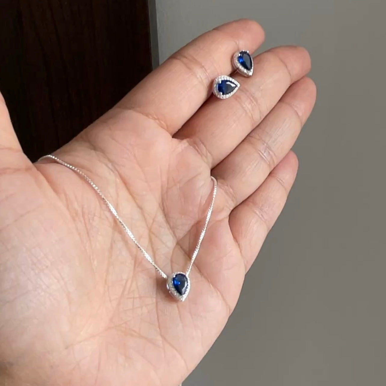 Este conjunto é a definição de elegância atemporal. O design clássico em formato de gota, com a intensa cor azul safira, confere um toque de realeza e sofisticação a qualquer look. Perfeito para eventos especiais, festas ou para presentear com requinte.