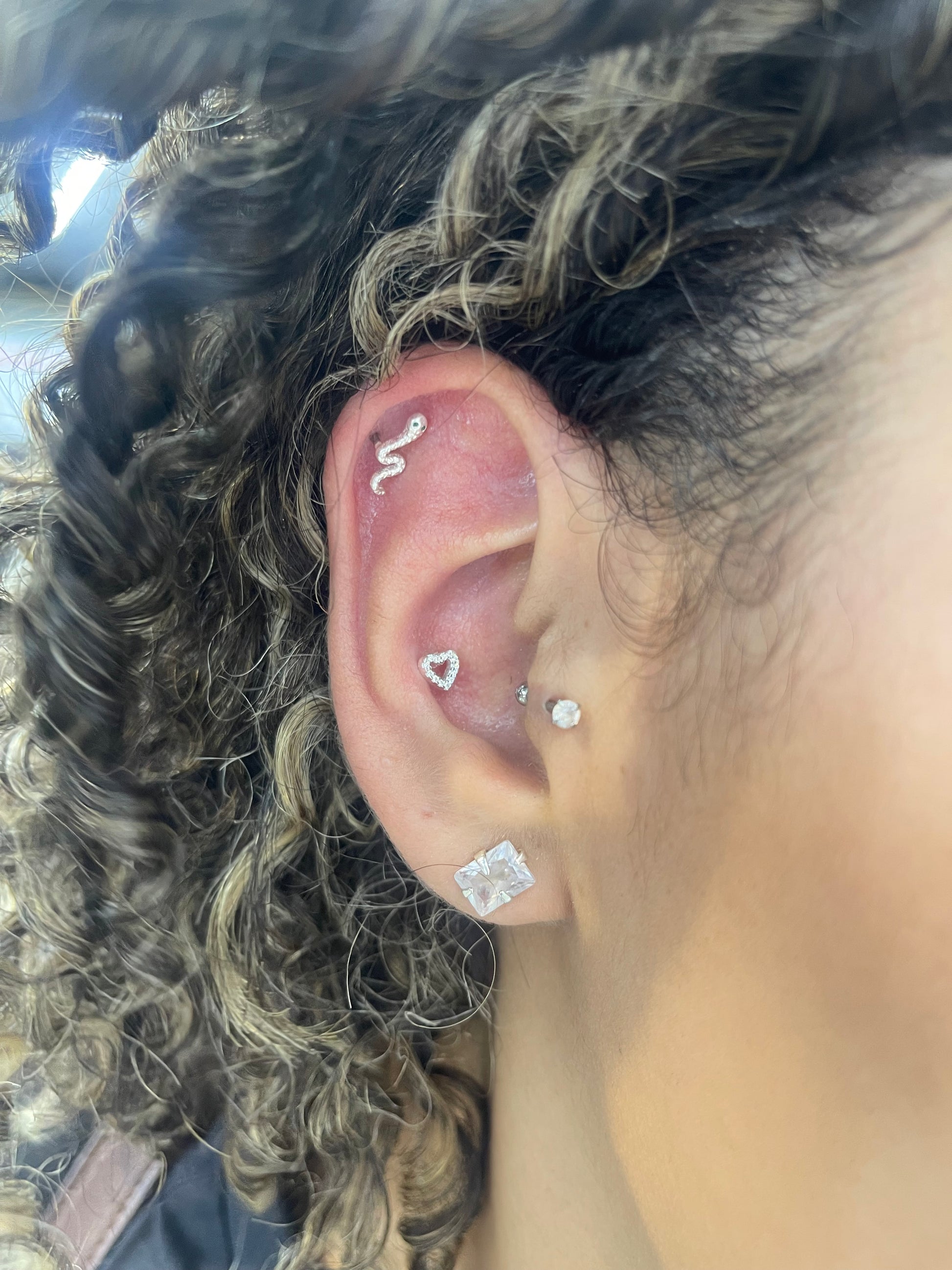 Piercing Trágus e Hélix Coração Vazado Cravejado