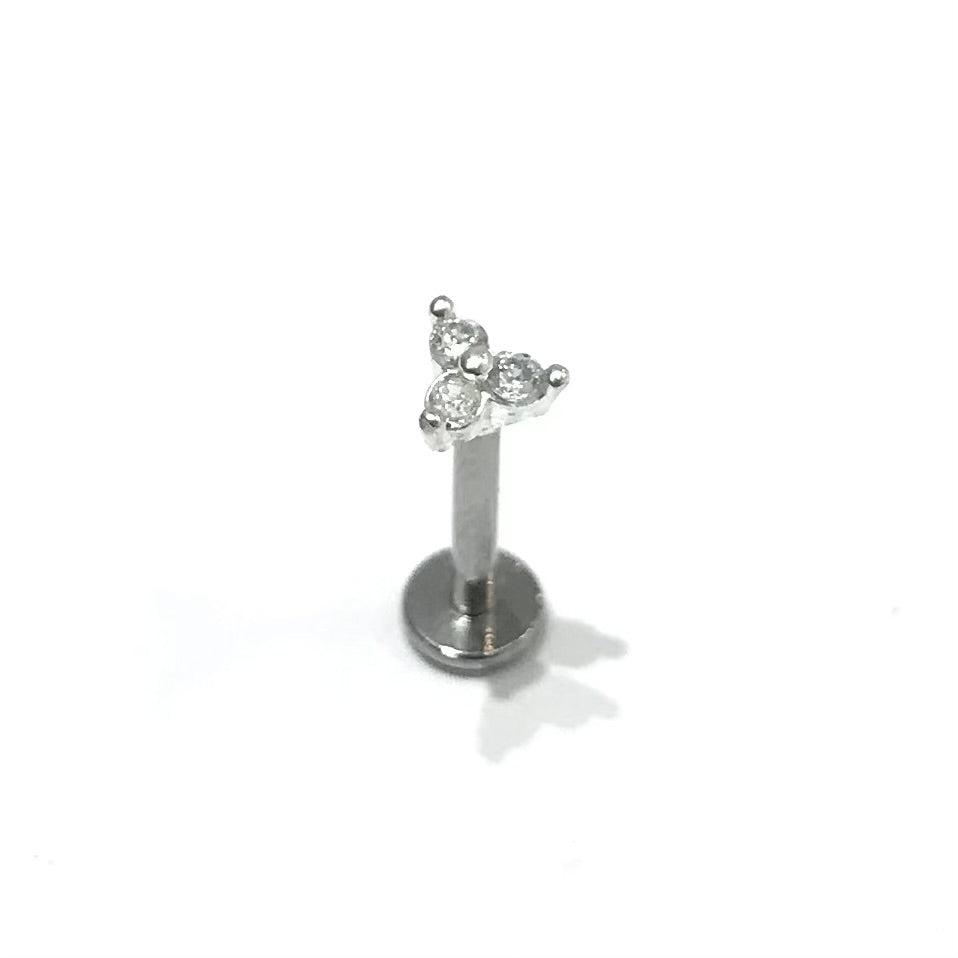 - Piercing tipo flor com três pétalas cravejada com zircônia;