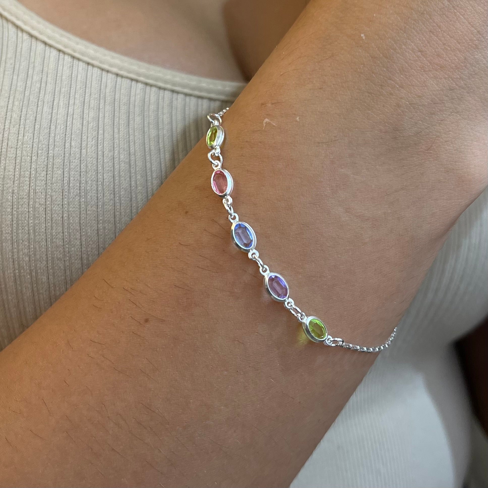 Detalhes da pulseira: Pulseira com 5 pedras oval coloridas na cor lilás, verde, rosa e azul na espessura de 4mm e com mini elos de 1mm a espessura;