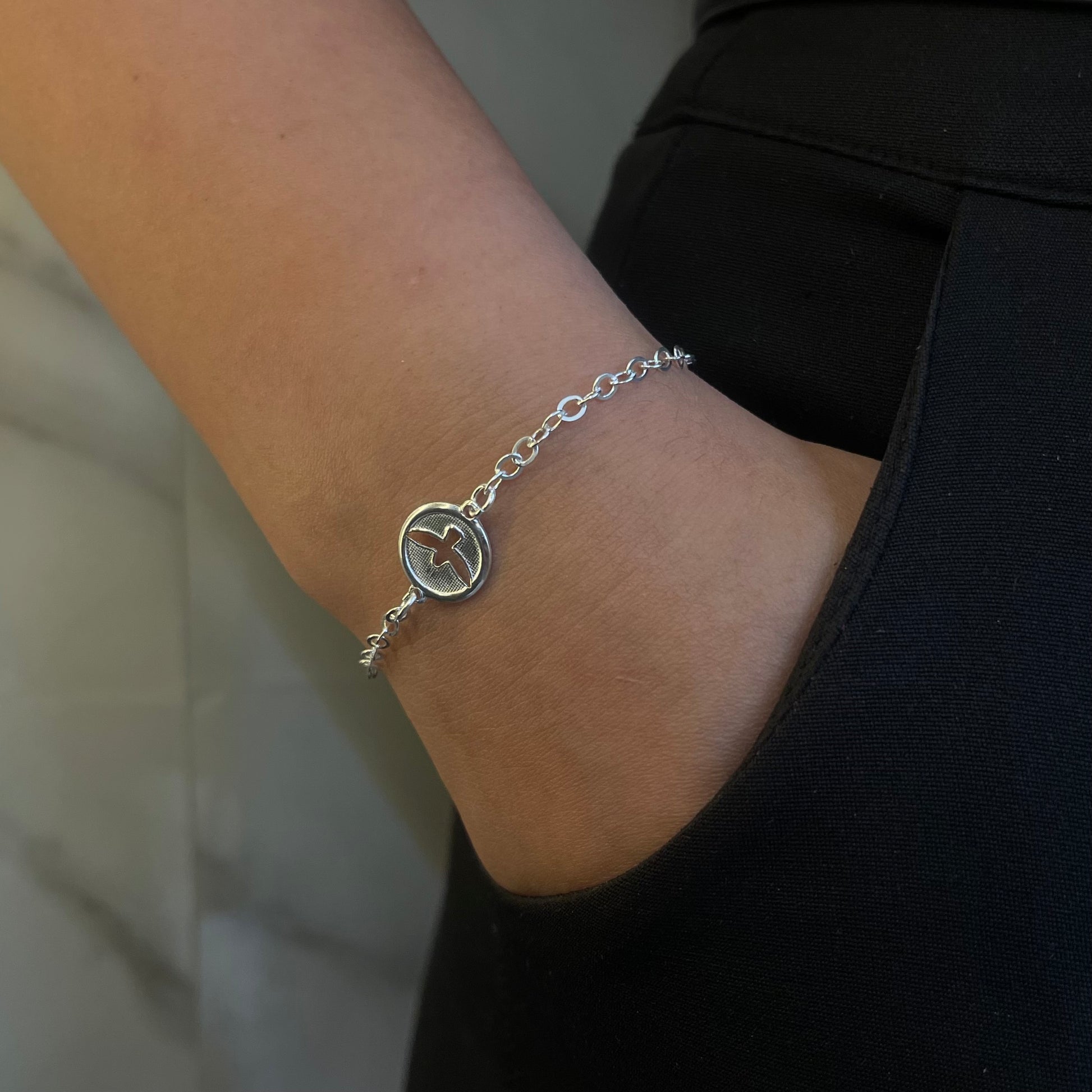 Detalhes da pulseira: Pulseira de elos de 3mm com pingente do Espírito Santo no meio de aproximadamente 12mm;