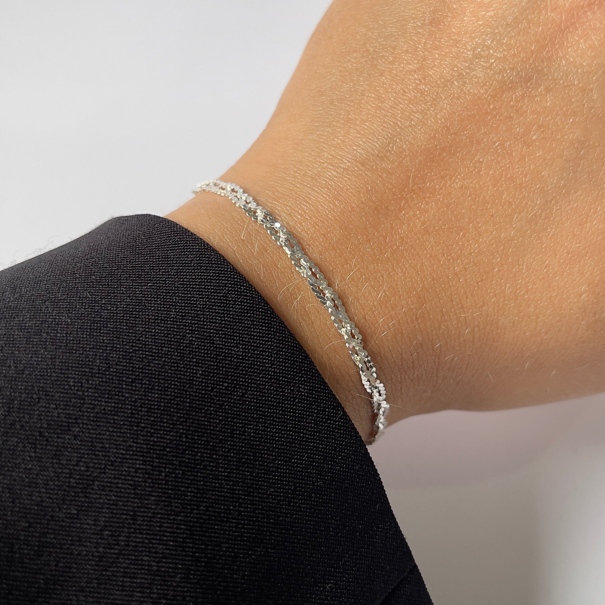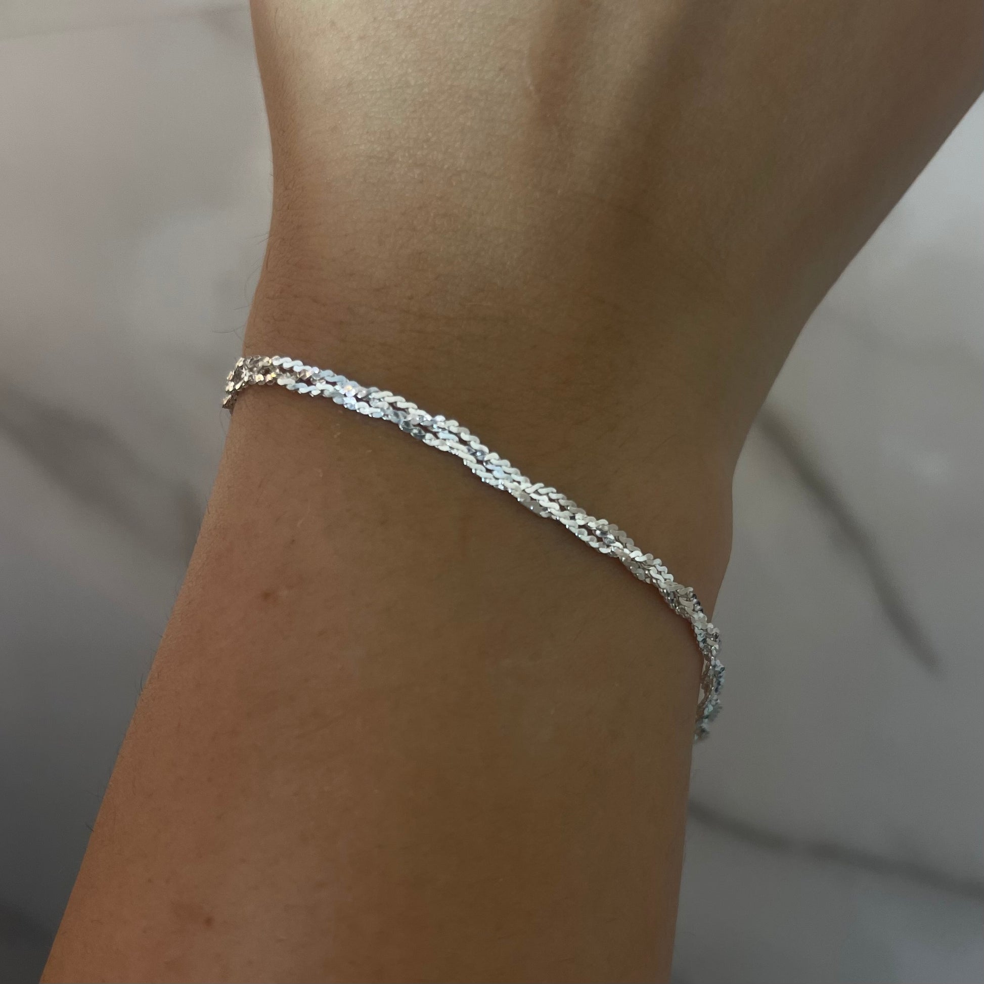 Detalhes da pulseira: Pulseira trançada em três fios com detalhes minimalistas.